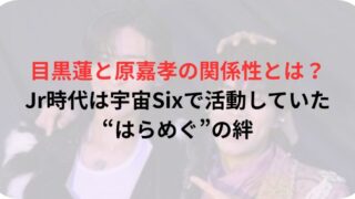 芸能・エンタメ 目黒蓮と原嘉孝の関係性とは?Jr時代は宇宙Sixで活動していた“はらめぐ”の絆 目黒蓮と原嘉孝の関係性とは?2人はジャニーズJr.時代に宇宙Sixで活動していた仲間で、「はらめぐ」として親しまれていました。再注目された理由と背景を分かりやすく解説します。 2026.01.17 芸能・エンタメ